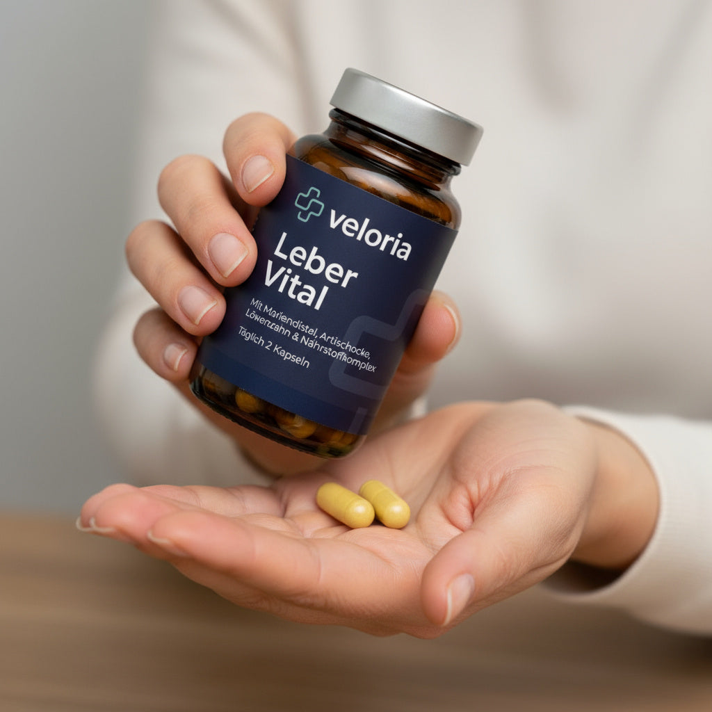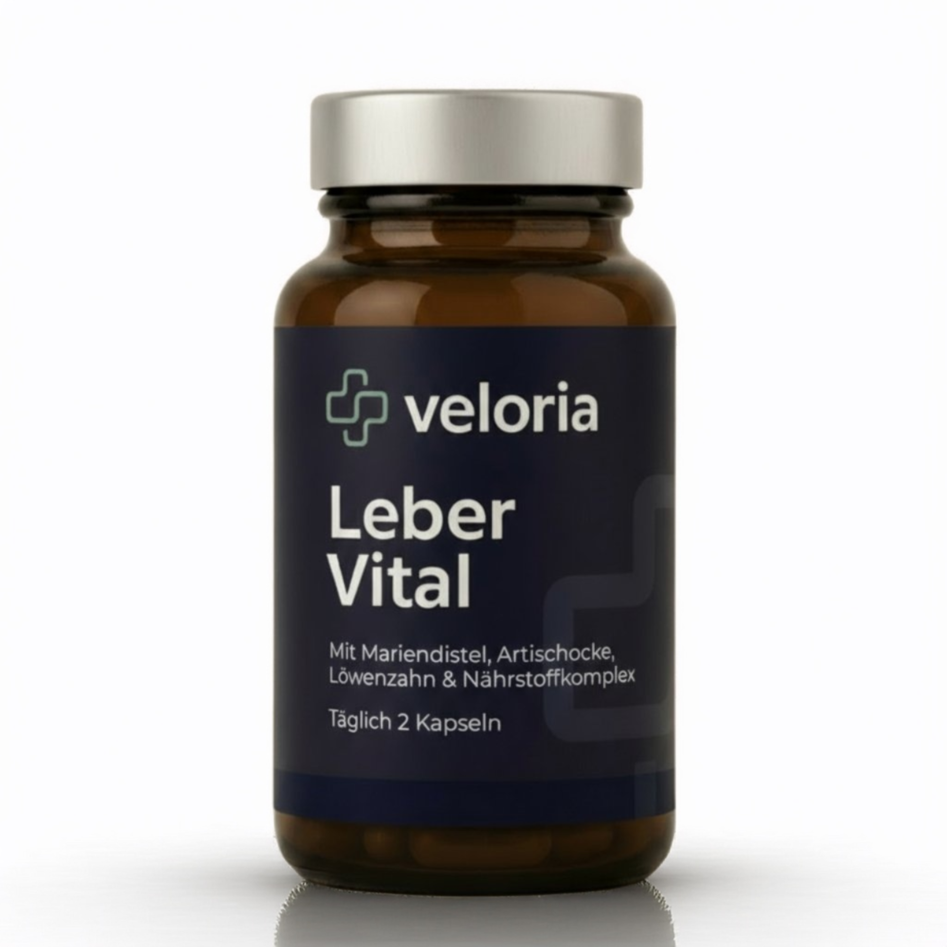 Veloria Leber Vital kombiniert bewährte Pflanzenextrakte wie Mariendistel, Artischocke, Kurkuma & Löwenzahn mit B-Vitaminen und Magnesium für eine optimale Lebergesundheit.*